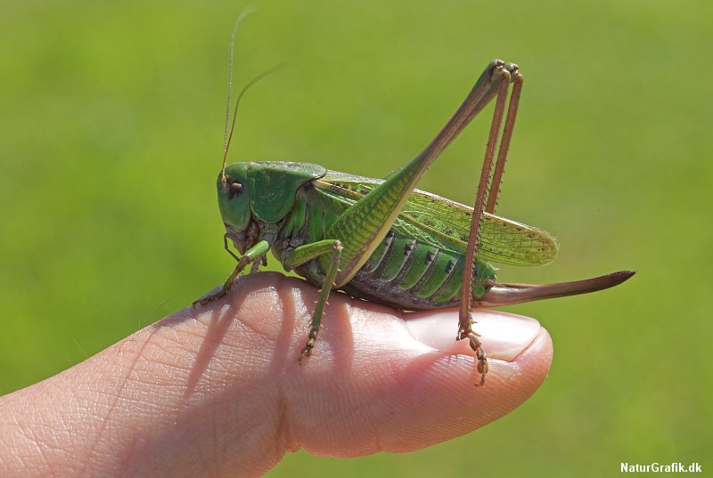 I Danmark har vi omkring 35-40 arter. En af de arter man kan træffe nu er den store vortebider. Ofte opdager man den tilfældig når man går igennem det høje græs. Pludselig springer en græshoppe, der er markant større end de vanlige markgræshopper. Navnet vortebider menes at komme af, at svenske bønder i 1700-tallet angiveligt brugte græshoppen til at bide vorter i troen på at vorterne ville forsvinde. Hunnen kendes på den lange læggebrod på bagkroppen. Brodden ser drabelig ud som en sabel, men er ganske harmløs. Til gengæld kan græshoppens anden ende bide mærkbart, hvis man tager den i hænderne.