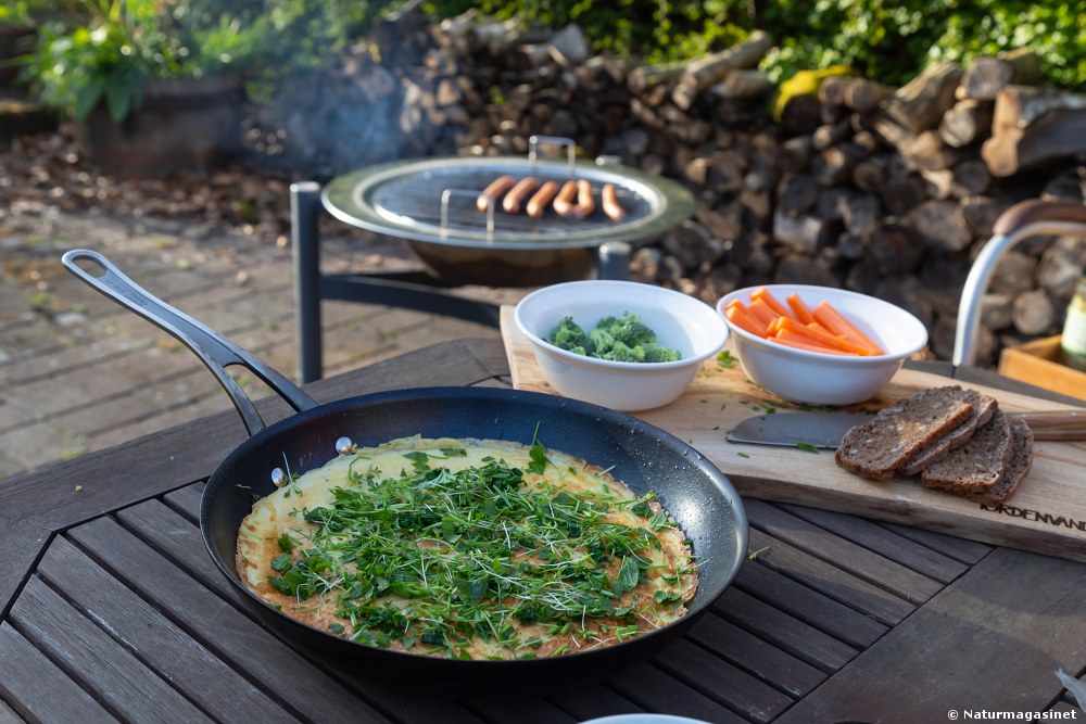 Mens sangdroslen synger i baggrunden og det lugter lidt af røg fra bålet, sidder jeg her med den nye kogebog fra Det Danske Spejderkorps, der byder på 69 bålopskrifter fra skolehavekonceptet “Haver til Maver” – testet af spejdere. Aftenens menu er æggekage med friske urter og efterfølgende bagepapirsindpakkede bagte æbler med kanel – bagt i en gryde med sand i bunden over rolige gløder. Begge er opskrifter fra “Ild, mad og fællesskab”. Jeg er dog ikke på spejderlejr, men såmænd blot på terrassen i haven, hvor vinden har lagt sig – og familien sidder samlet omkring bålfad, pande og gryde, hvor børnene – efter modvilligt at have sluppet mobiltelefonen, nu er optaget og engageret i vores fælles projekt.