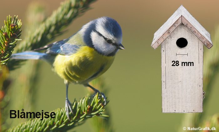 Blåmejsekassen er lig musvittens, men redehullet skal være mindre for at tilgodese den mindre blåmejse. Lav flyvehullet 28 mm. Derved kan skovspurve og musvitter ikke overtage kassen. Både musvitter og blåmejser bebor også gerne redekasser, der hænger lavt. Du kan derfor fint hænge kassen op i hovedhøjde, hvilket også gør den lettere at rense. I mange sommerhusområder findes også sortmejse og topmejse (primært Jylland), der også gerne yngler i blåmejsekassens dimensioner.