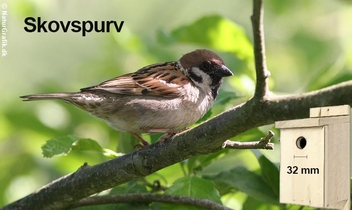 Skovspurven er i de senere år rykket tæt på hus og haver. Den yngler meget gerne i redekasser. Den klarer sig med et redehul lidt mindre en gråspurven. 32 mm er fint. Skovspurven er ret alsidig og kassen kan placeres på en husmur eller et træ i 2- 4 meters højde. Kassens indre mål bør være ca. 10×10 cm.