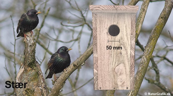 Stæren kræver en flyvehul på 5 cm. Kassen bør være mindst 35 cm lang med et indvendigt mål på mindst 10×15 cm. Flyvehullet placeres ca. midt i kassens øverste trediedel. Stæren er ret social og kasserne kan gerne placeres tæt, ja, nærmest i kolonier, uden at de giver voldsomme naboproblemer. Kassen bør være mindst 3 meter oppe i et træ eller på f.eks. en gavl, men gerne højere.