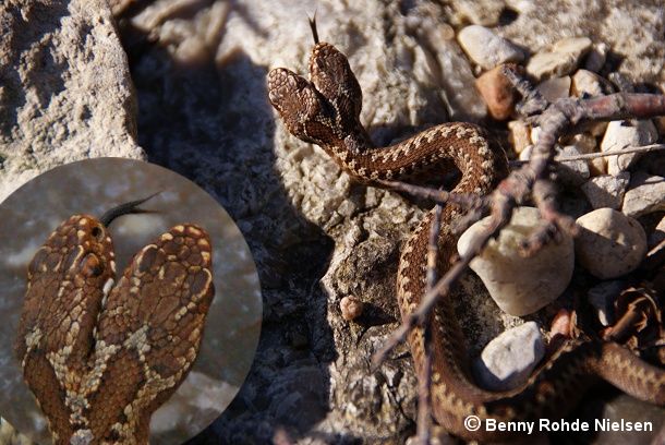 ”Den var ca. 15 cm. lang og på tykkelse med en kuglepen. Det så ud til, at begge hoveder fungerede lige godt. Den spillede med begge tunger. Heldigvis havde jeg mit kamera med og nåede at tage nogle billeder af slangen inden den forsvandt”, fortæller Benny Rohde Nielsen.