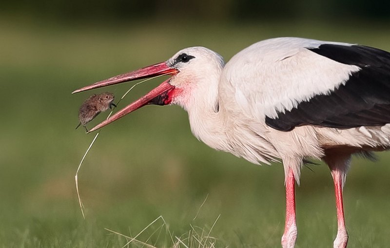 En stork er ikke kostforagter. Her snuppes en markmus. Foto: Daniel Dunca/Dreamstime.com.