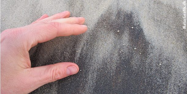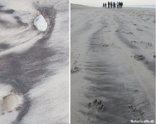 Kvartssand og tungsand danner smukke mønstre på strandbredden, fordi de opfører sig på forskellige måder i bølgerne og i vinden, og derfor aflejres forskellige steder.
