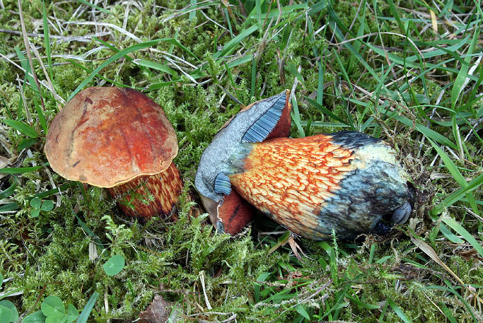 - At der også findes en Brunstokket rørhat (Boletus badius) som også blåner ved såring og er spiselig?