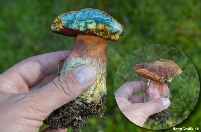 - At Rodrørhat (boletus radicans) også blåner, men er sjælden, smager bittert og spises derfor ikke?