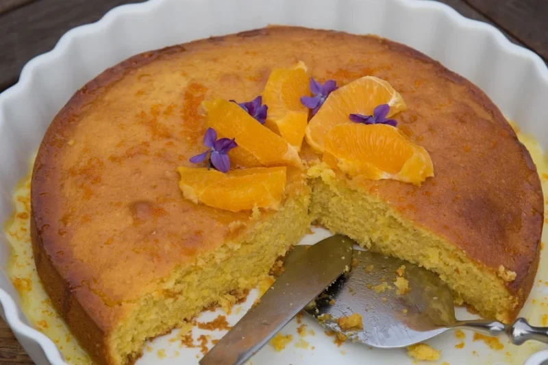 Pynten består af en sirup. Sukker, appelsinsaft og -skal bringes i kog og koger indtil sukkeret er opløst. Det hældes over den lune kage. Til sidst pyntes der med appelsinstykker og violer.