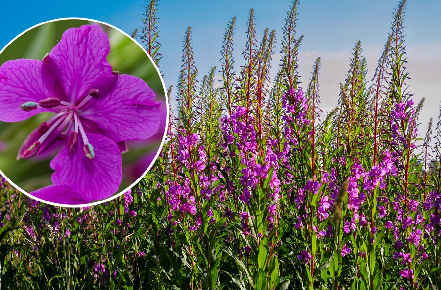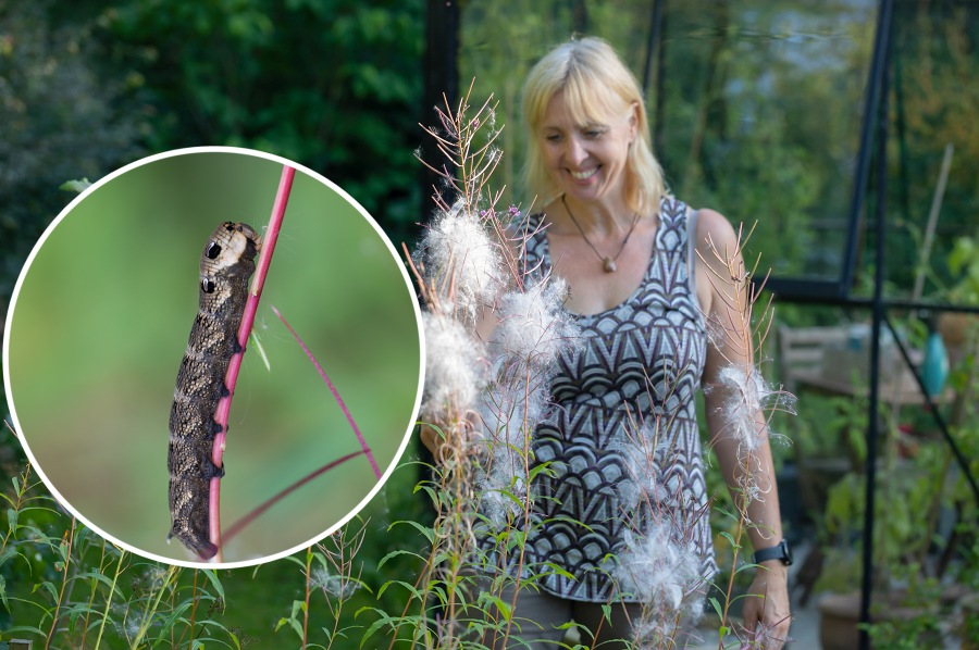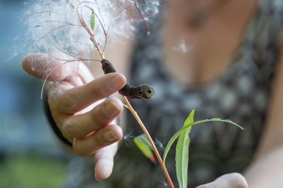 I juli har jeg dagligt glædet mig over de violette blomster – og så skete det! Her i en skøn, mild augustdag opdagede jeg pludselig ikke bare én, men to store larver af dueurtsværmeren. Larverne spiser lystigt af bladene af de vilde blomster, der nu står med store, uldne fnok-stande i toppen og næsten ligner bomuld. Hvis man forsigtigt rører ved larverne løfter de forkroppen og trækker hovedet sammen, så de store øjne på forkroppen virkelig syner – i håb om at skræmme en potentiel fjende.