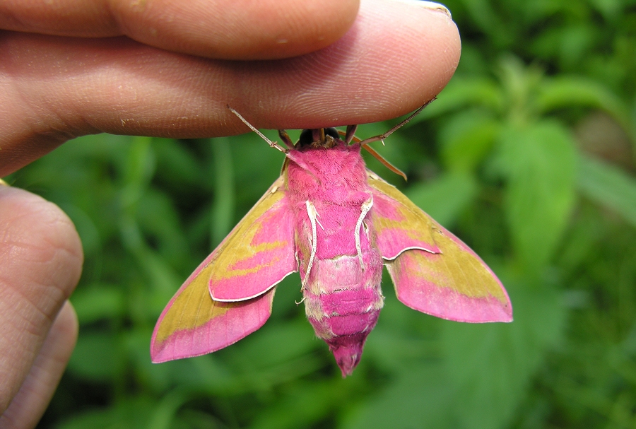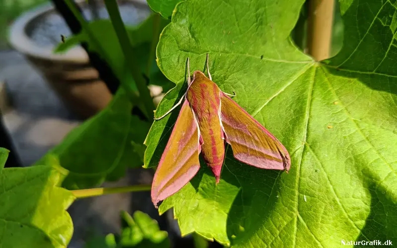 Den voksne aftensværmer, dueurtsværmeren har jeg ofte set i haven. Tidligere på sommeren var et eksemplar kommet ind i drivhuset og gemt sig i vinrankerne. Den voksne aftensværmer ligner virkelig et indslag fra troperne med sine smukke lyserøde og olivengrønne farver.