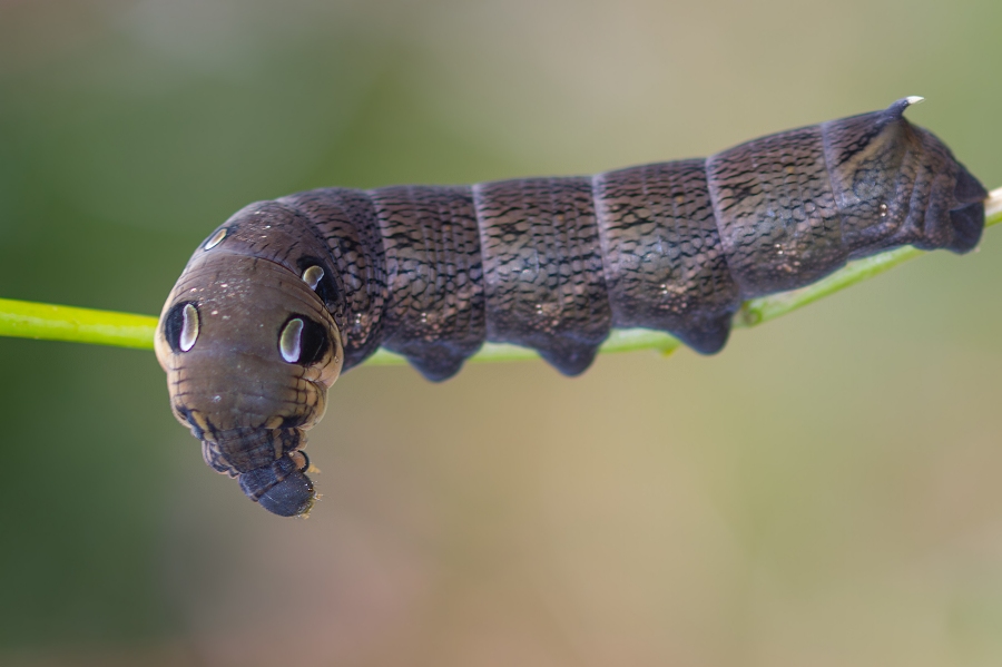 Det er fascinerende, så eksotiske nogle af vores hjemlige sommerfuglelarver ser ud. De findes i et væld af farver og mønstre med pletter og striber – og med og uden strittende hår og børster. Én af dem er dueurtsværmerens larve. Den kan blive imponerende stor, ca. 8-9 cm, med store, sjove snydeøjne, der gør larven endnu mere personlig.