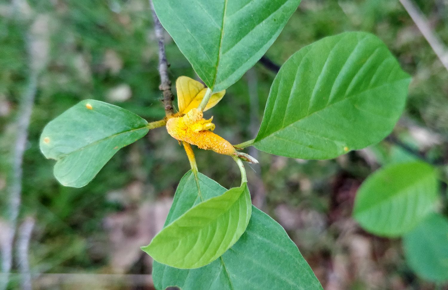 Naturvejleder Niels Lisborg har kigget nærmere på billedet – og fortæller at træet er en Tørst (Rhamnus frangula), der i øvrigt er værtstræ for citronsommerfuglen. Den gule farve er en svamp, der kaldes kronrust (Puccinia coronata). Den lever som en parasit på værtsplanten. I naturen volder svampen normalt ikke store problemer, men rust kan også angribe landbrugsafgrøder, hvilket kan give udbyttetab.