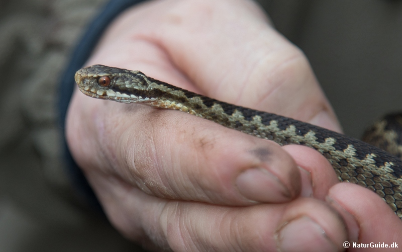Slangen liver lidt op ved mødet med de varme hænder, men ikke mere end den bliver roligt liggende i Jans hænder. Den løfter kun hovedet lidt da den bliver fotograferet til NaturGuide.dk.