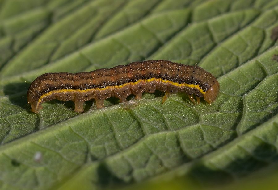 Der var en enkelt smutuglelarve, men de fleste var haveuglelarver. Begge er natsværmere og nu ved jeg heldigvis, at de sagtens kan overleve på andre planter i haven (bl.a. brunelle) end sønnens favorit tomatplante, så de blev alle nænsomt sat udenfor i haven, hvor jeg kan hilse og fortælle, at de trives i bedste stil på planter, hvor de ikke gør skade. Dog er nogle af dem nok blevet spist af havens fugle…