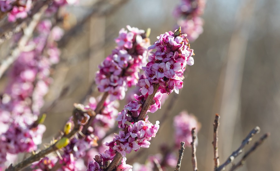 De lyserøde blomster har en kraftig duft og tiltrækker gerne de tidlige insekter i foråret. Foto: Niels Lisborg.