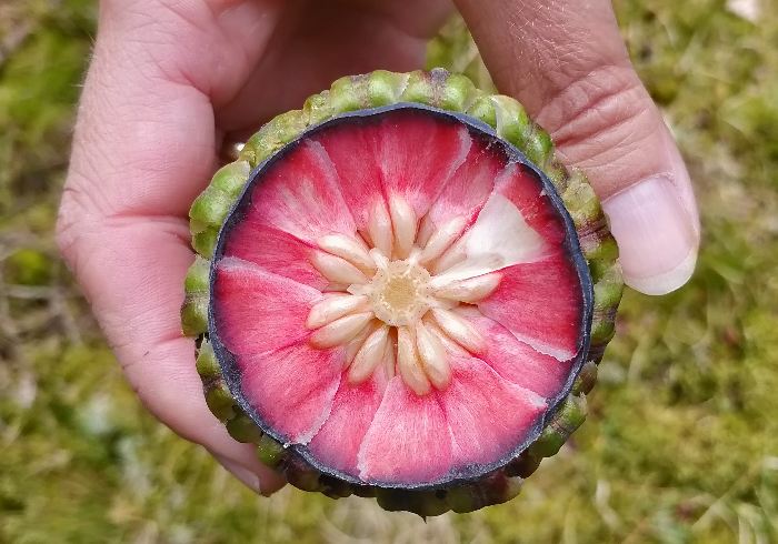 En læser har sendt nogle fine billeder af en stor, skællet kogle, der er helt rød indeni og spørger hvilke slags kogle er det? Det ligner lidt en rød ananas, men er fundet i en dansk skov på Sjælland.