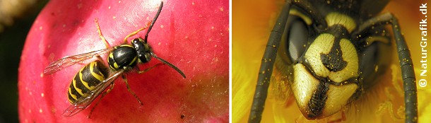 Vi har omkring 10 arter af gedehamse i Danmark. De færreste bryder sig om at komme tæt på hvepsene, men de artsbestemmes relativt let når de i sensommeren er optaget af moden frugt eller besøger os på rov efter søde sager. Den almindelige gedehams (højre foto herunder) kendes let på den sorte, ankerformede plet mellem øjnene. Her har tysk gedehams tre fine pletter, der danner en trekant, imens skovgedehamsen kun har en enkelt plet.