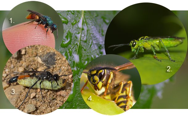 Der findes flere hundrede arter af hvepse i Danmark, men i daglig tale er det først og fremmest de sort-gule gedehamse (4), der tænkes på når der nævnes hvepse. Gedehamsene er de eneste hvepse, der reelt generer os og af og til giver mennesker ubehagelige stik. På fotoet herover ses en smuk guldhveps (1) og en grøn bladhveps (2) samt en sandhveps (3) med bytte. Ingen af disse hvepse er aggressive overfor mennesker.