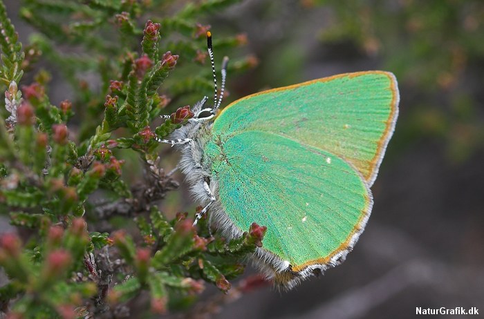 Vi har kun én anden egentlig dagsommerfugl, der er grøn. Det er den lille, smukke Grøn busksommerfugl (Callophrys rubi). Grøn busksommerfugl kan ikke forveksles med andre danske sommerfugle. Den grønne farve er ret i øjnefaldende og følehornenes og benenes sorte og hvide striber er tydelige. Vingefanget er 22–27 mm. Bagvingen har en lille spids. Sommerfuglens latinske navn Callophrys betyder “smukke øjenbryn” og hentyder til den fine hvide tegning, der ses over sommerfuglens øjne.