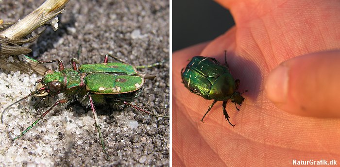 I øvrigt har vi flere meget fine, grønne biller i den danske natur. Og de kan i øvrigt også flyve da de gemmer vingerne under skjoldet. Nogle af de mest markante er Grøn sandspringer (Cicindela campestris) og Grøn guldbasse (Cetonia aurata) og Kobber-guldbasse (Potosia cuprea).