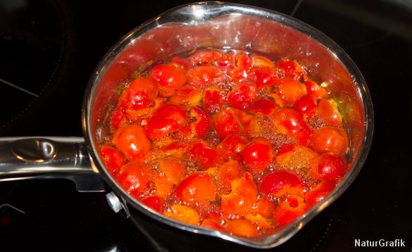 TIP: Når hybenfrugterne skal klargøres, er det nemmest først at fjerne stilk og blomst. Herefter halveres de og kernerne fjernes med en lille ske eller en urtekniv.