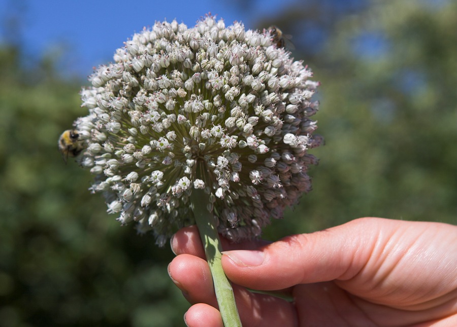 Har man plads i et hjørne af køkkenhaven kan man få fine og spændende blomster ved at lade flere af de traditionelle afgrøder gro i stok og sætte blomst.