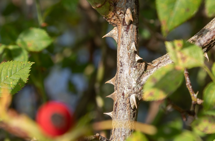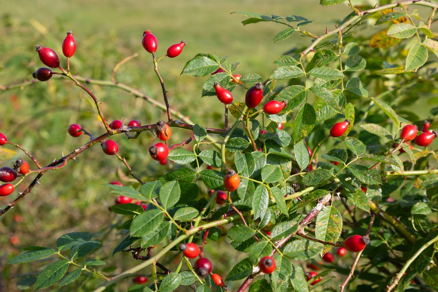 De vilde hunderoser står med deres røde hyben på de tornede buske langs markskel, hegn og vejkanter fra september-oktober indtil fuglene senere på året efterhånden æder frugterne.