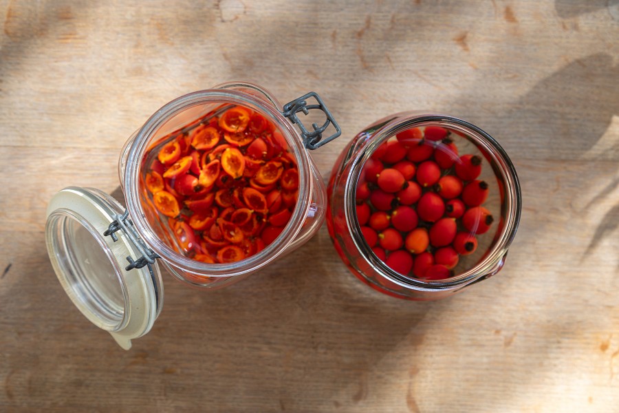 Derefter fylder jeg et rent glas med de rensede hyben og hælder en neutral snaps eller klar vodka over. Låget skrues på, og glasset stilles i vindueskarmen.