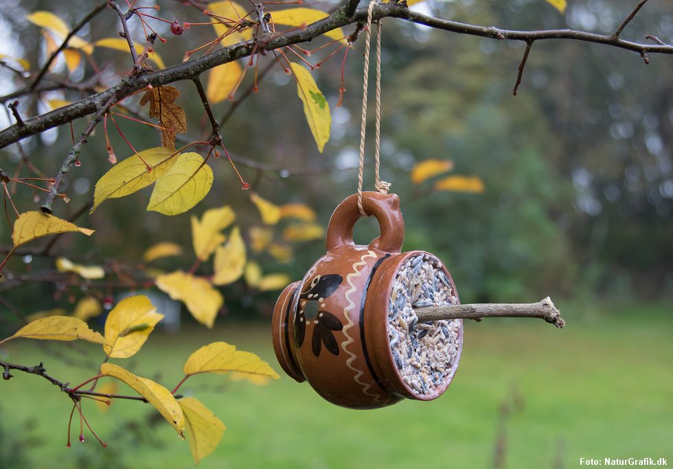 Prøv som alternativ til butikkernes mejsekugler at lave en dekorativ mejsekop fyldt med fedt og fuglefrø. Mejserne elsker det – og kopperne i træerne kan være ganske dekorative.