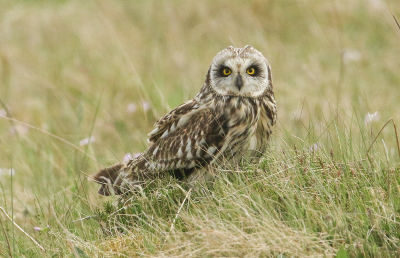 Da vi stiger op på toppen af en klit og lader kikkerten afsøge terrænet, finder vi hurtigt vores ugle igen. Den har sat sig på en klittop, kun ca. 200 meter ude. I kikkerten kan vi tydeligt se uglens gule øjne. Det ser næsten ud som om uglen har lagt en sort make-up rundt om øjnene. Det gule i det sorte får uglens blik til at se stikkende, intenst ud.