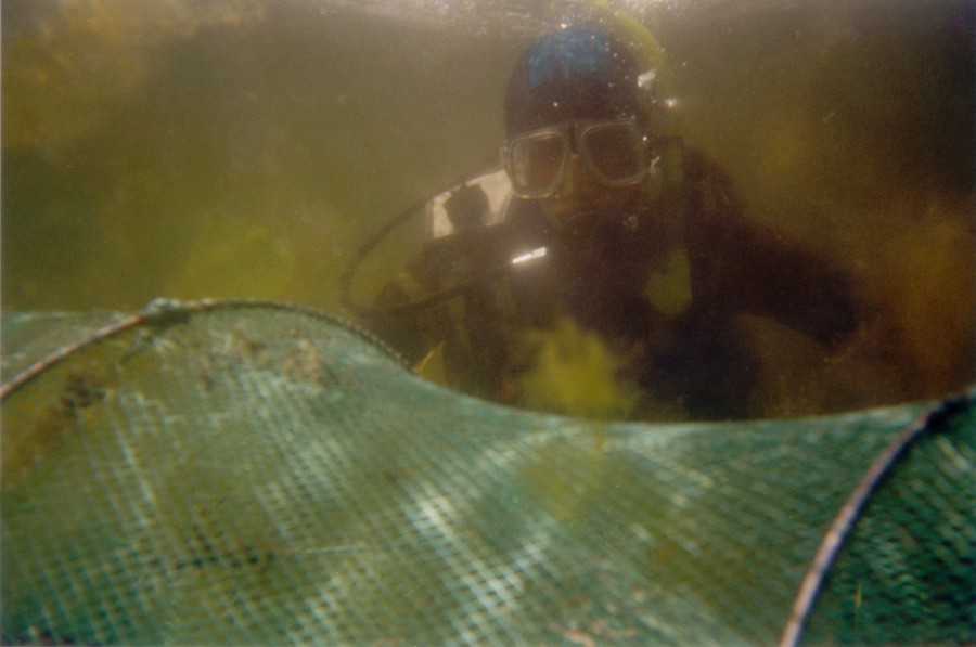 En dykker besigtiger en ruse i en lagune i Isefjorden. Algerne bevirker en meget dårlig sigtbarhed – og næsten ingen liv på bunden. Foto: Niels Lisborg.