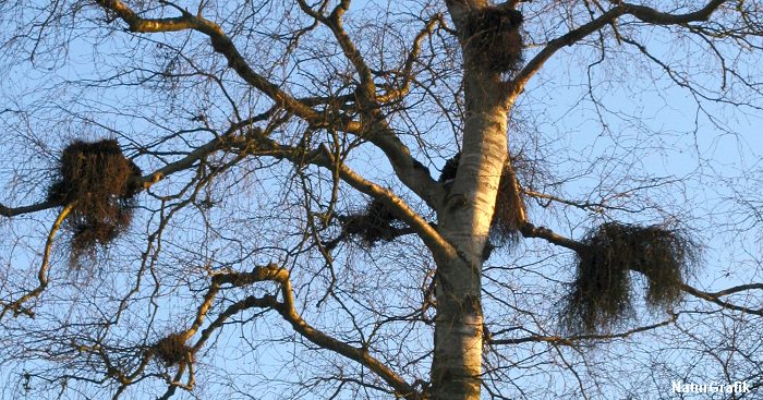 Nu hvor de fleste blade er faldet af træerne kommer et finurligt fænomen til syne flere steder. Store buskede klumper i trækronerne. På afstand ligner de nærmest fuglereder. Men hvis man kigger lidt nærm