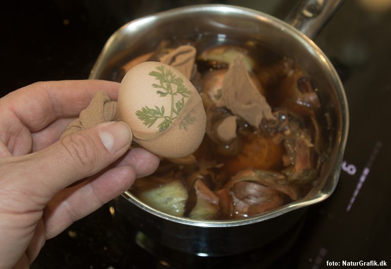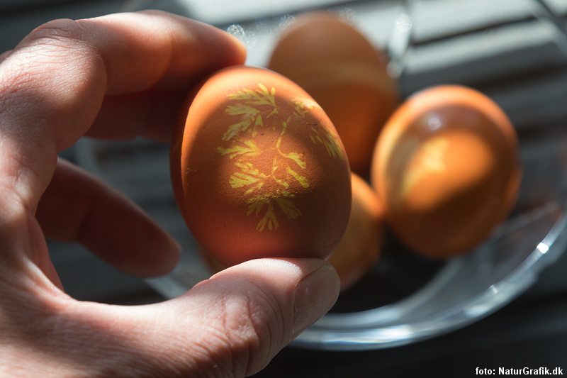 Du kan også lave, flotte mønstre på æggene ved at tage en blomst, blad eller lignende – og lægge det tæt til æggeskallen, hvorpå det fastholdes ved at vikle et stykke af en nylonstrømpe omkring ægget. Kog i ca. 10 minutter – og fjern derefter nylonstrømpe og plante – og se det smukke mønster.