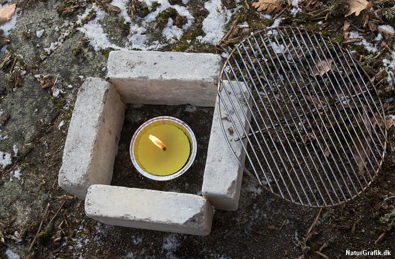 Her kommer et eksempel på hvordan den kan laves med god isolering. Her er det en lerkrukke på et stativ men en helt almindelig krukke på jorden kan også bruges.