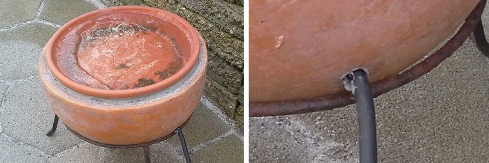 Man kan selv lave en anordning som både kan være en nem og billig løsning. Lav en cirkel eller firkant med sten (brosten eller andre lidt kraftige sten). De skal stå tæt sammen så vinden ikke blæser lysene ud, men også så fuglene ikke kommer ind til lysene. Det er dog vigtigt, at lysene får lidt luft tilført, for ellers kan de ikke brænde. Sæt en metalplade, rist eller lignende ovenpå stene som kan tåle varmen fra flammen og øverst stilles fuglebadet, der også skal kunne tåle varmepåvirkning fra lysene. Et granit-fuglebad er her optimalt.