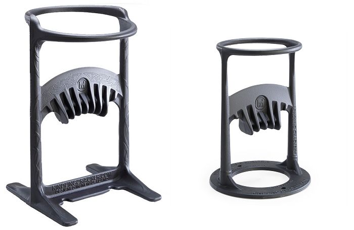 Den originale Kindling Cracker fås i to størrelser. Den mindste model kan flække brændestykker med en diameter på 15-16 cm. Den store model, der desuden er flot udsmykket med keltiske ornamenter, kan klare en diameter på godt 22 cm. Jeg har valgt den mindste model – og billigere model, der fint dækker vores behov til bålbrænde. Begge modeller er fremstillet i sort støbejern og fungerer ved at man placerer brændestykket på den økselignende klinge.