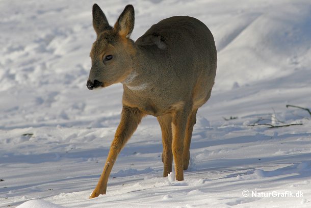 Rådyret er vores mindste hjorteart. Skorpe-sne gør det svært for dyrene at nå føden under sneen. Foto: Niels Lisborg