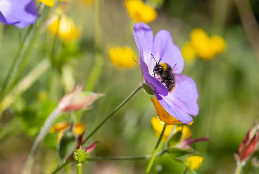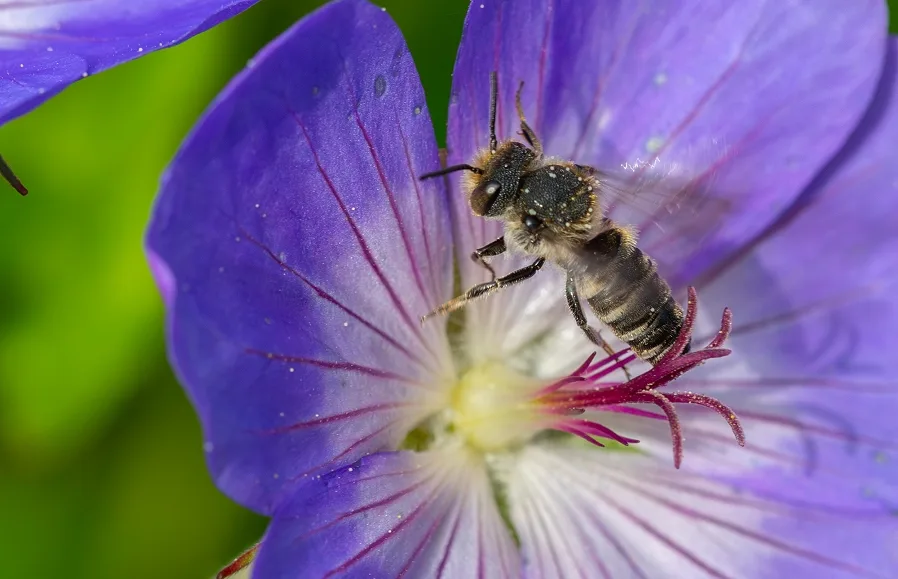 Blomstrende storkenæb (Geranium) i haven åbner for en oplevelsesrig safari blandt vilde bier og andre insekter.