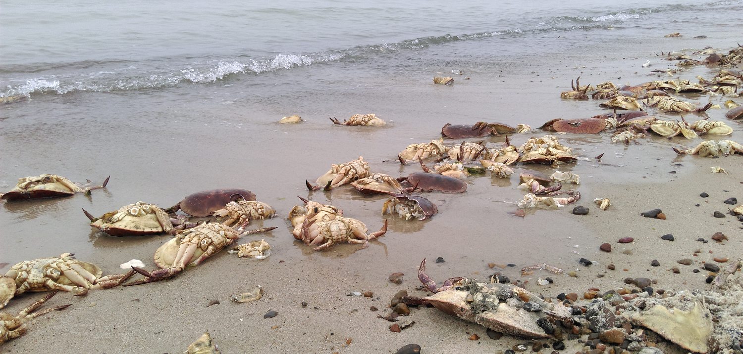 Inge, der holder sommerferie ved den jyske vestkyst, nærmere bestemt ved Vorupør i Nordvestjylland, har undret sig over store mængder store, døde krabber på stranden. Hun skriver: