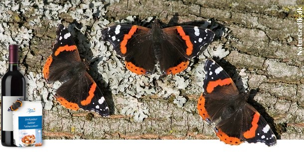 Man behøver dog ikke at have overmoden frugt eller blomstrende stauder for at lokke admiralerne til. Lidt billig rødvin og lidt sukker kan gøre det. Sommerfuglen kan lugte alkoholen på flere hundrede meters afstand og følger duftsporet frem til kilden.