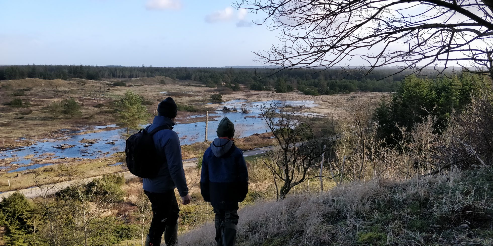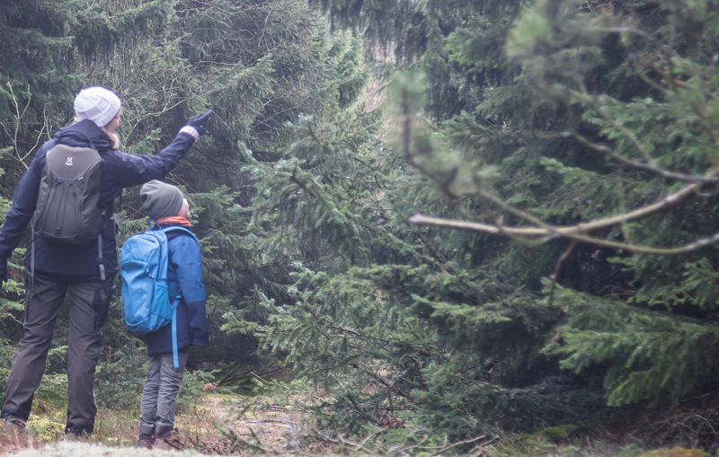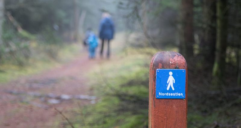 Bilen kvitterer med et blink da vi låser og efterlader den på en parkeringsplads i kanten af skoven. Her er kun en enkelt bil udover vores, så det er ikke mange, der på en hverdagsmorgen har fået samme tanke. Vi har valgt at vandre ad en lille bid af Nordsøstien – en vandrerute, der dækker 26. regionener fra Danmark, Norge, Sverige, Tyskland, Holland, England og Skotland, hvor redningsveje, kirkestier, kongeveje, drivveje og sejlture er kædet sammen med natur- og kulturhistoriske seværdigheder. Vores lille tur går gennem et plantageområde – og af hensyn til børnene er ruten kun et par km ud og tilsvarende tilbage igen med lidt afstikkere undervejs. Se evt. vandre med børn.