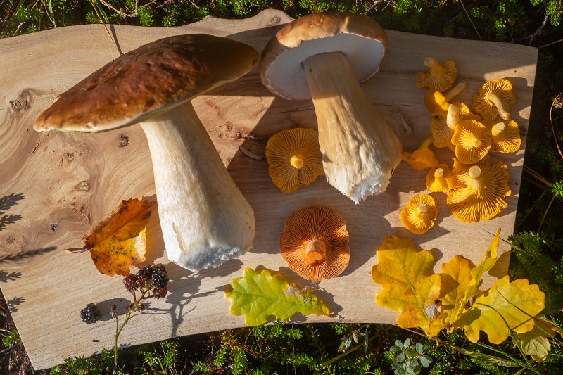 Spiselig rørhat (Karl Johan) og kantareller. Finske forskere har påvist at skovsvampe har et meget højere indhold af D-vitamin end dyrkede svampe.